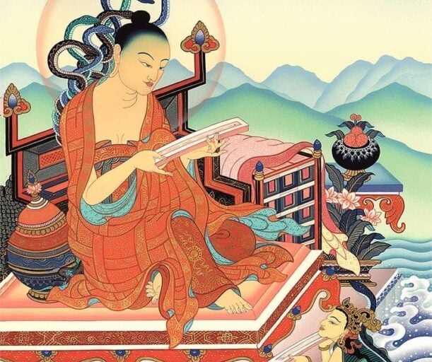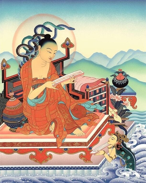 El rey de los nagas, abrumado por la comprensión de la verdad más allá de las palabras, se rindió ante la sabiduría del maestro Nagarjuna, reconociéndolo como su guía espiritual.